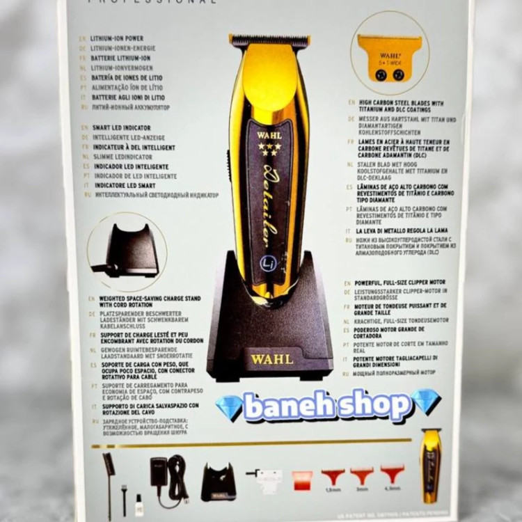 تیغه T-wide دارای پوشش های تیتانیوم و DLC است بنابراین تیغه ها خنک تر می مانند و در نتیجه در برابر خوردگی مقاوم هستند و بسیار قوی هستند.تیغه T-wide قابل تنظیم (#2215-700) را می توان با فاصله صفر برای کوتاه کردن بسیار نزدیک به صفر استفاده کرد.وال دیتیلر گلد از یک موتور قیچی قدرتمند و کامل برای اصلاح صاف انواع مو استفاده می شود که بیش از 100 دقیقه کار می کند و دارای باتری ال آیتیوم یونی با شارژ هوشمند LED است