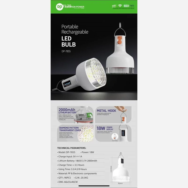 #لامپ لامپ شارژی 💡 برند DP مدلDP-7855 قابل شارژ قابل حمل لامپ LED 18W 2000mAh اورجینال